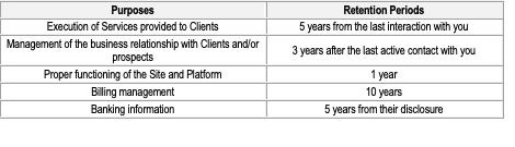 Your Personal Data is retained only for the duration necessary to fulfill the various purposes defined in Article 3 above, except in cases where the law permits or requires longer retention.